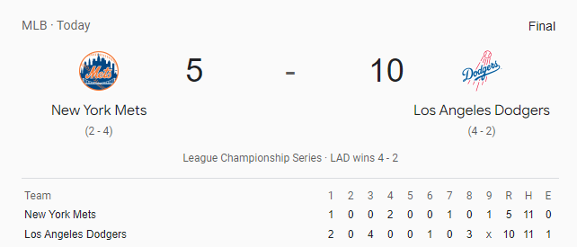 뉴욕 양키스가 10회 연장 끝에 클리블랜드를 꺾고 월드 시리즈 진출을 확정한 지 하루 만에, 다저스는 다저 스타디움으로 돌아와 뉴욕 메츠를 압도적인 경기력으로 제압하며 내셔널 리그 챔피언십 시리즈 6차전에서 승리했습니다. 이로써 다저스는 월드 시리즈로 진출하게 되었고, 메츠의 기적 같은 플레이오프 여정은 막을 내렸습니다.